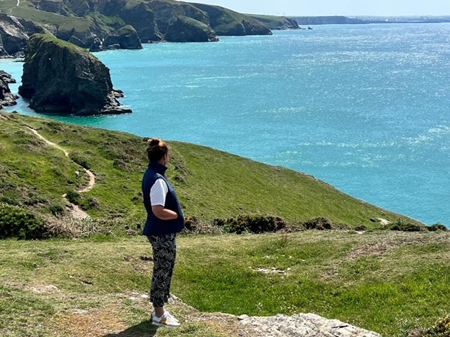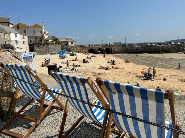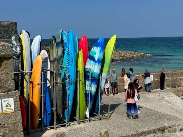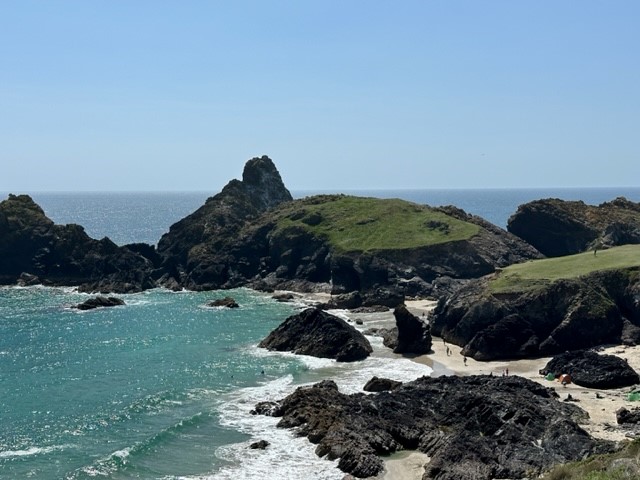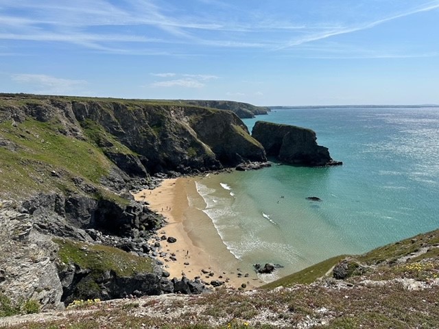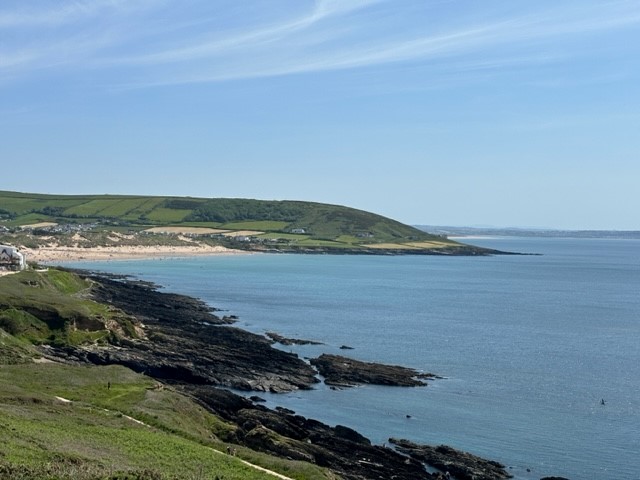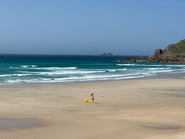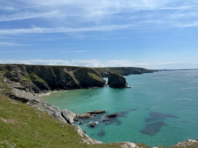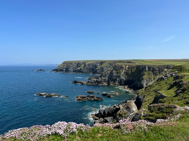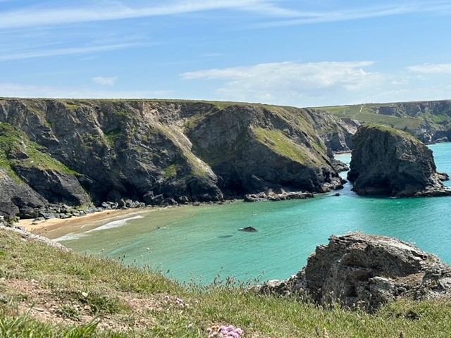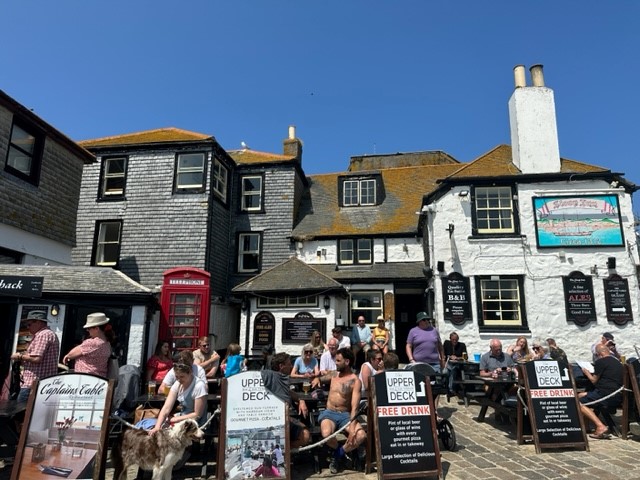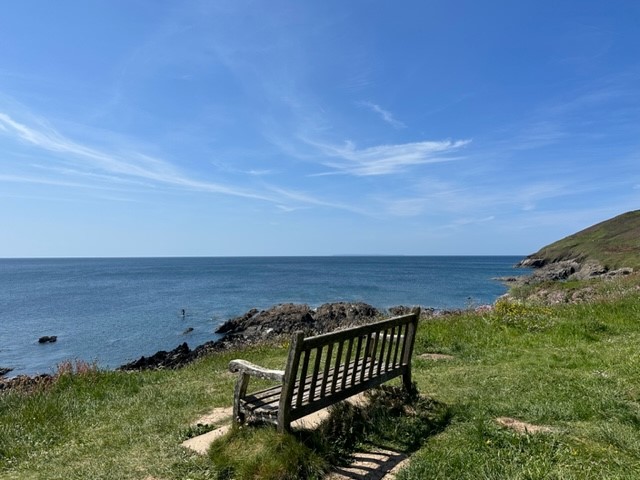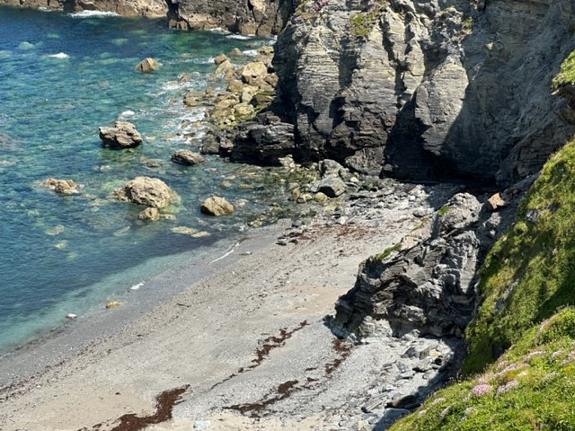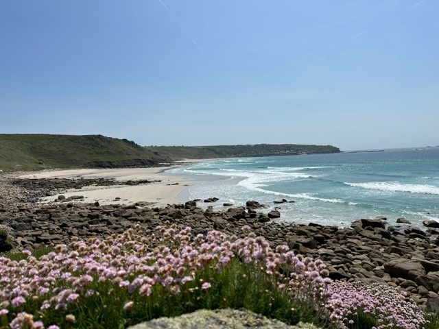Eine anstrengende, in zweierlei Hinsicht atemberaubende Etappe! Um St. Ives Head herum führte die Wanderung an der St. Nicholas’s Chapel (Schutzpatron der Seeleute) und einer Hütte vorbei, in der früher Sardinen von den Klippen aus gesichtet wurden. Beim Verlassen von St. Ives nahm die Zahl der Wanderer rapide ab, ebenso wie mein Tempo, da der Weg über eine Reihe von steilen Abhängen führte. Tatsächlich kletterte ich manche Passage auf allen vieren. Nach River Cove ging es hinunter zu Felsen, wo man manchmal Robben beobachten kann, die sich auf den Felsen sonnen. Dann folgte ein letzter steiler Anstieg, von dem wir einen Pfad ins Landesinnere nahmen, der uns nach einer halben Meile in das Dorf Zennor führte, das eine malerische Kirche, ein kleines Museum über das Leben in Cornwall und einen großartigen alten Pub namens The Tinner’s Arms https://tinnersarms.com/ beherbergt. Hier gönnten wir uns ein frisch gezapftes Bier. Da ich bei Bier nicht sehr bewandert bin, bat ich um ein „light and crispy beer“, was dem untergärig gebrauten Lager entspricht. Das obergärig gebraute Ale ist mir zu süss und vollmundig, die Hefe zu präsent. Diese Etappe mit ca. 12 km ist nicht zu unterschätzen und wir entschieden ein Taxi zurück zu nehmen. Aufgrund einer langwierigen Schleimbeutelentzündung in der Hüfte, war ich vorsichtig. Generell sollte man immer viel mehr Zeit einplanen, als die Wander-App angibt, da man aus dem Staunen nicht herauskommt. Einfach Platz nehmen und Blicke und Gedanken in die Ferne schweifen lassen.