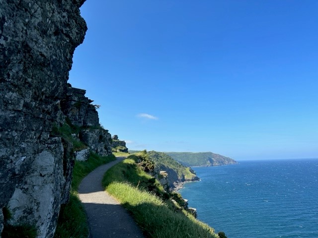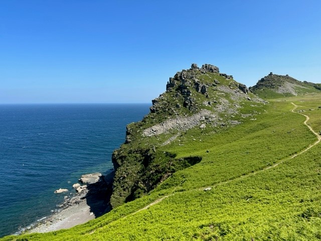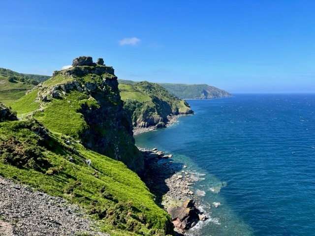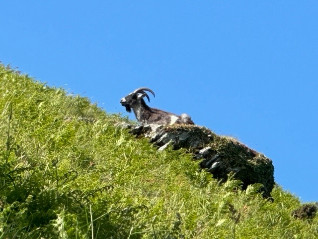 Auch am letzten Tag wurden wir noch einmal mit praller Sonne und eindrucksvollen Bildern verwöhnt. Von Lynton aus erreicht man direkt zu Fuß Valley of the Rocks. Dies ist eine großartige Option für eine leichte bis mittelschwere Rundwanderung um das Valley of the Rocks, eine absolut atemberaubende Gegend im Exmoor in Nord-Devon. Vor vielen Jahrtausenden wurde dieses zerklüftete Tal auf dem Trockenen sitzen gelassen, als sein Schöpfer, der Fluss Lyn, seine Meinung änderte und seinen Lauf änderte, um bei Lynmouth ins Meer zu münden. Das Tal ist ein stimmungsvoller und bisweilen unheimlicher Ort, der Schriftsteller wie Samuel Taylor Coleridge und William Wordsworth inspiriert hat, und seine zerklüftete Architektur spiegelt alte Legenden wider. Auf unserem Weg sahen wir gespaltene Gipfel, dramatische Klippen und weite Ausblicke auf das Meer . Und sogar die eine oder andere Wildziege!