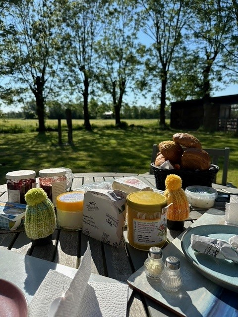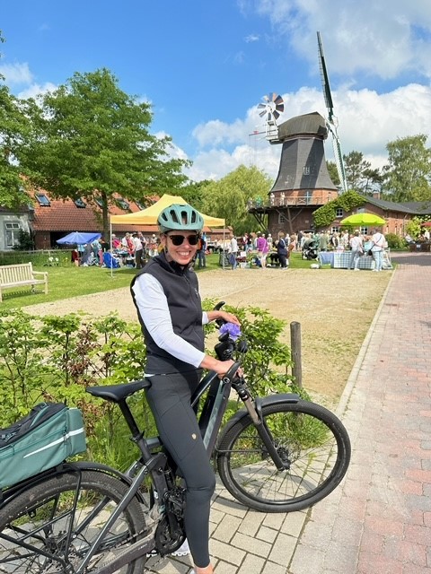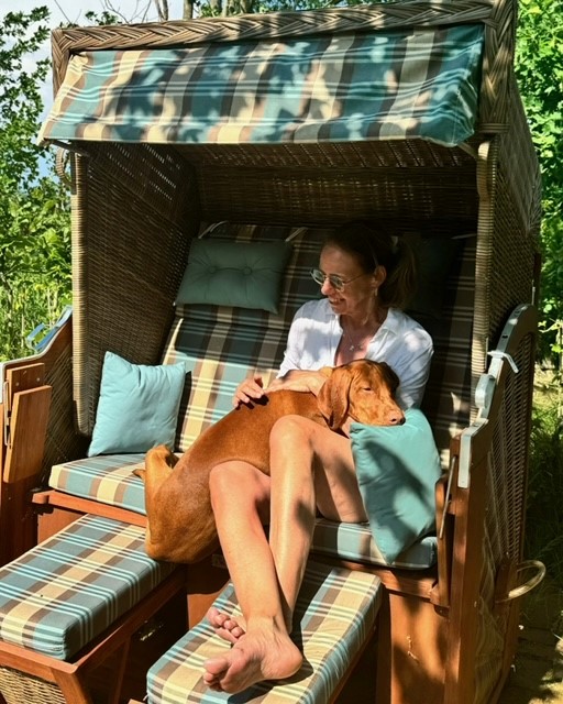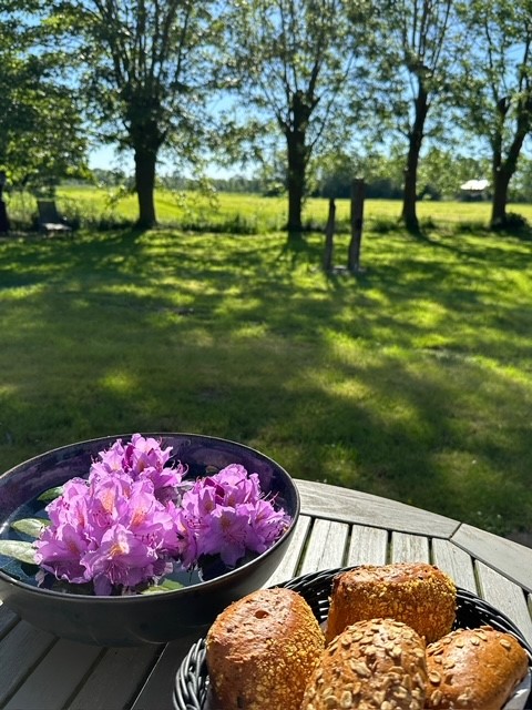 Unser VW T5 war voll beladen mit E-Bikes und 2 großen Hundefahrrad- Anhängern. Vor Ort stellte sich jedoch heraus, dass mein Partner nach seiner Schulter OP doch noch nicht weite Strecken mit dem Fahrrad zurücklegen konnte. Die morgendliche Tour aus dem Seefelder Moor und die nicht enden wollende Landstraße entlang nach Schwei zum Bäcker wurde mein tägliches Highlight. Ich genoss die gesamt 14 km Strecke in Sonne und Wind; vorbei an Kühen, Pferden und Schafen. Hasen kreuzten, Fasane, Rebhühner und Rehe entdeckte ich. Da plötzlich ein Fohlen, dort Kälbchen. Besonders empfehlenswert in der „Dorf Bäckerei Ahlers“ sind die Gourmetbrötchen und das Schwarzbrot mit Nüssen und Datteln. Viele Autos begegneten mir nicht, manchmal rannte ein Hund bellend hinter mir her. Hier trifft der moderne Begriff „entschleunigend“ wirklich zu 100 Prozent zu. Kam ich zurück war der Tisch gedeckt und wir zelebrierten ein ausgiebiges Frühstück in der Sonne. Die Hunde genossen das 4000 m² Grundstück.