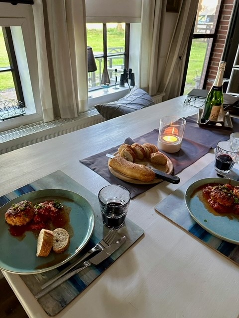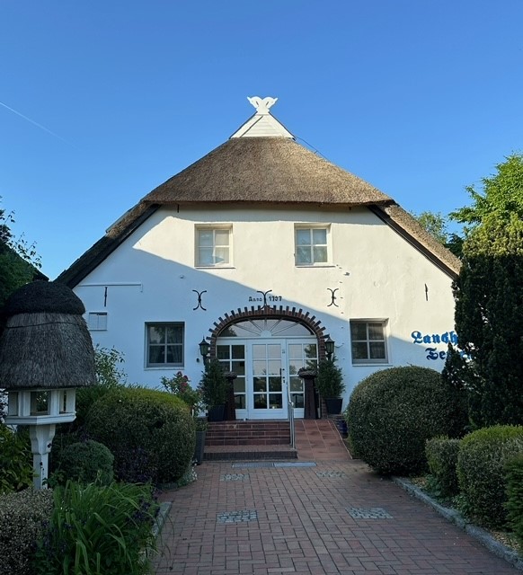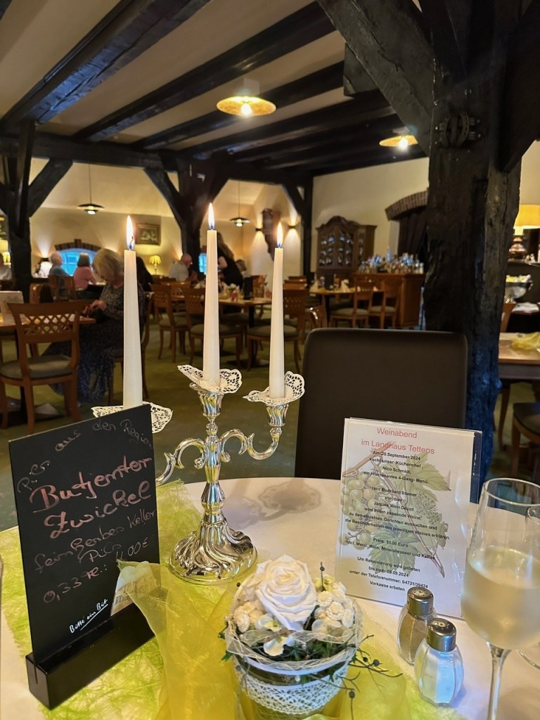 Eigentlich hätten wir jeden Abend so gemütlich essen können, an meinem Geburtstag aber wollten wir ausgehen. Das Restaurant hat uns ausgesprochen gut gefallen; wir wurden sehr zuvorkommend bedient und das Essen war von hervorragender Qualität. Die Rede ist vom Landhaus Tettens https://www.landhaus-tettens.de/welcome.html. Entzückend war, dass mein Geburtstagstisch im Gegensatz zu allen anderen Tischen Kerzen und Stoffservietten hatte. Eine amüsante Anekdote gibt es auch dazu. Ich fragte, ob wir anstoßen wollen. Als die junge Bedienung mich fragend ansah, ergänzte mein Partner etwas „prickelndes“ vielleicht. Auch dann kam kein Vorschlag. Jetzt fiel ihm noch das Adjektiv „perlig“ ein, worauf sie uns einen Kräuterschnaps anbot. Den dort bevorzugt getrunkenen „Jubi“ Aquavit stellten wir jedoch ans Ende des Abends. Wir hatten Lammrücken für 2 Personen am Tisch tranchiert mit Gemüsevariation und Kartoffellasagne vorbestellt und wurden nicht enttäuscht. Ein paar Tage später sahen sie uns wieder, da sie uns versprachen ein weiteres Lammgericht, diesmal im Wirsingmantel zu servieren. Auch das war himmlisch. Einen dritten Abend entschied ich zu Königsberger Klopsen.