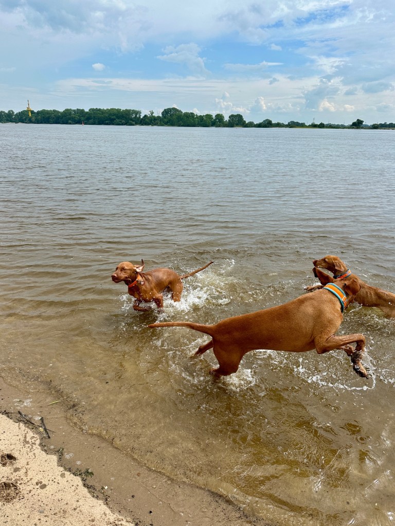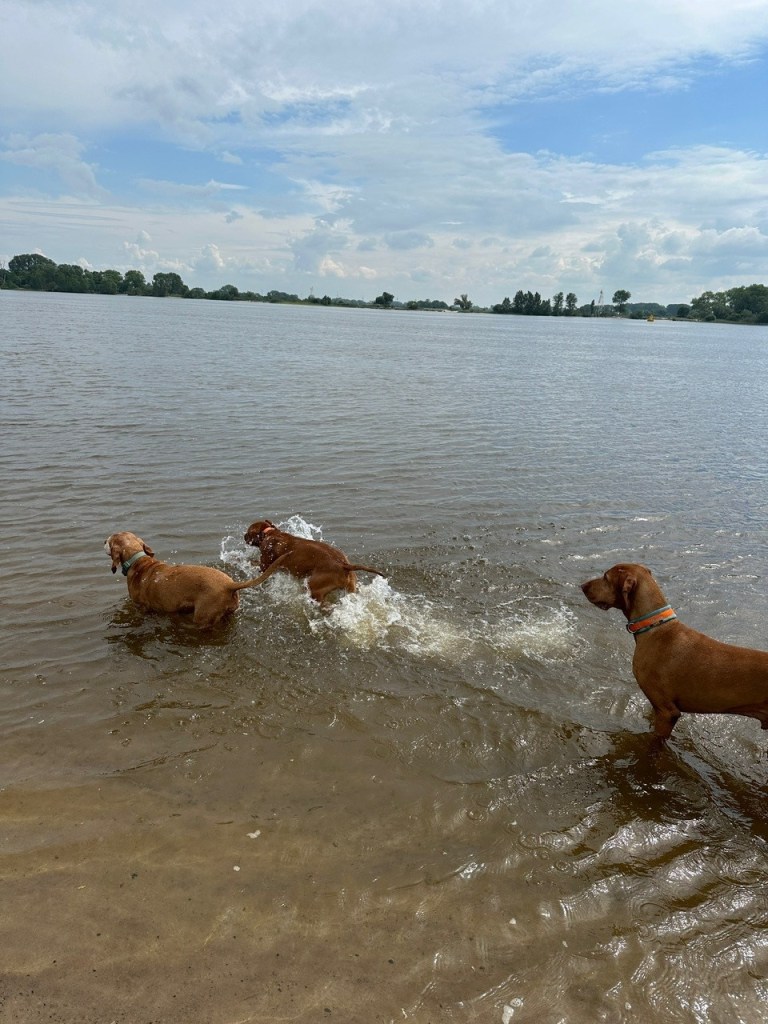 Natürlich fuhren wir nachmittags die Kleinstädte in der Nähe, wie Varel, Dangast und Fedderwardersiel, an, hielten uns aber nicht lange auf, da wir für die Hunde ein attraktiveres Ziel fanden. Ich möchte nicht falsch verstanden werden; ich habe vollstes Verständnis, dass z.B. Deiche für Hunde natürlich tabu sind, auch Leinenpflicht akzeptiere ich, nicht jedoch die Hundeflächen hinter Bauzäunen. Richtig weit laufen konnten wir dagegen am Weserstrand bei Oberhammelwarden (Brake). Hier konnten Hazel und August das Wasser genießen, ausgiebig rennen und lebhaft spielen. Und für alle Vizsla Liebhaber: Sonntags um 11 Uhr ist hier ein bekannter Treffpunkt. Zum Glück erfuhren wir darüber und wurden herzlichst empfangen.